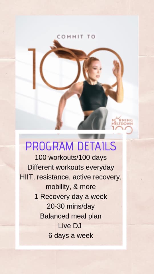 This program is called Morning Meltdown 100, where you do 100 workouts at your own pace. My group is to help guide you along this process and to give you the accountability partners and support you need along the way of this amazing journey. I love this program because it is not only designed to help you become more fit, but to also help you mentally and spiritually. These workouts can help you fulfill your happiness without even knowing it. You become a different person on this journey to committing and completing 100 workouts. Take this journey with me! COMMIT to yourself and your well being! I made the commitment, Are you?